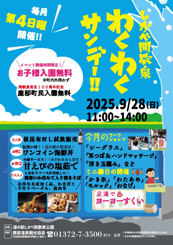 毎月第4日曜日開催「しかべ間歇泉わくわくサンデー!!」イベント開催中、お子様はしかべ間歇泉公園入園無料!先月好評だったミニ縁日も催しを増やしての開催🏮ワンコインの海鮮丼やこだわりソースの「鹿部いかほたて入り焼きそば」も是非お召し上がりください😊